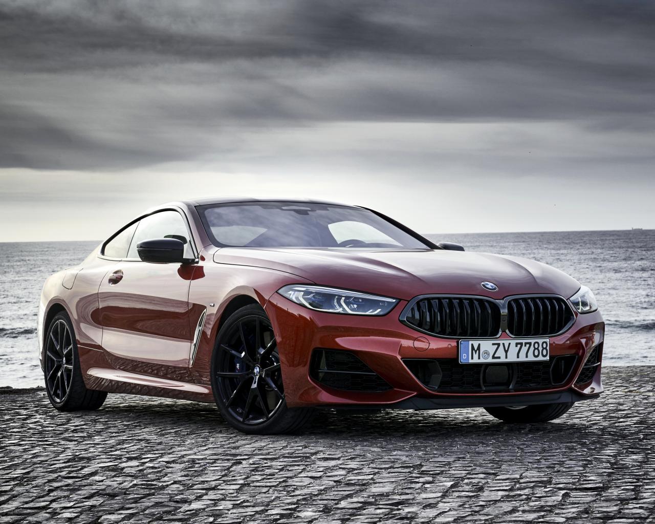 Wallpaper Red BMW 8 Series car on the background of the sea
