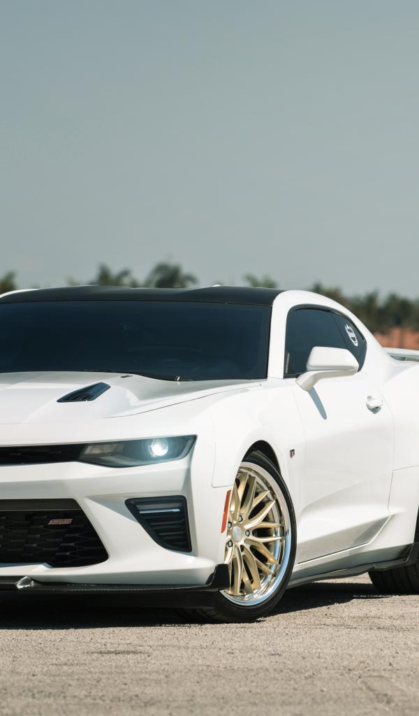 Wallpaper White car Chevrolet Camaro near the water