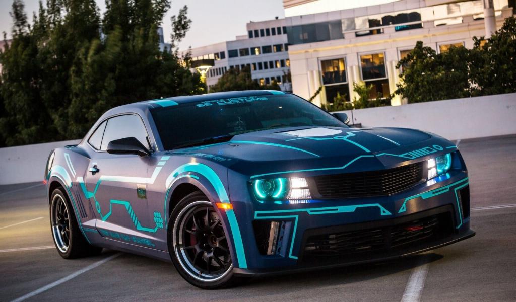 Wallpaper Neon Chevrolet Camaro in the parking lot