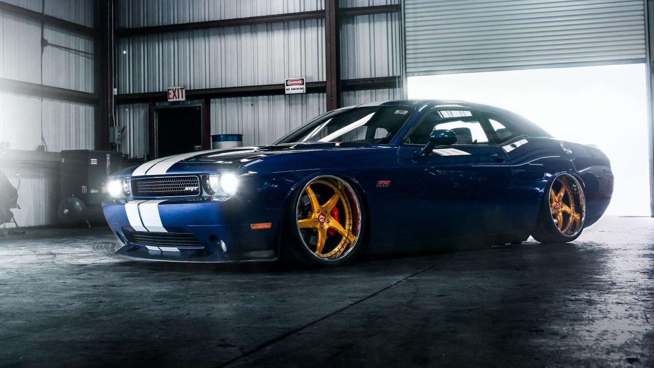 Wallpaper Blue sports car Dodge Challenger SRT 392 in the garage