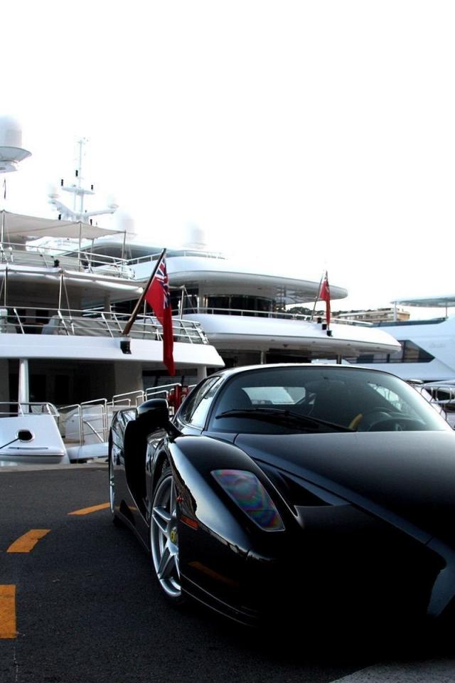 Wallpaper Black Ferrari on a background of white yacht
