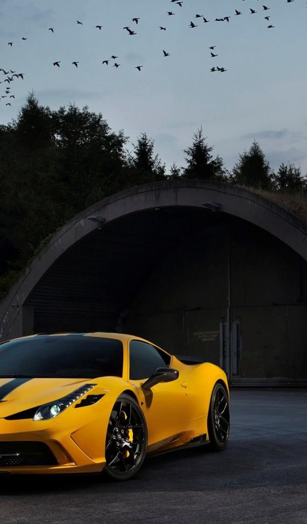 Wallpaper Yellow Ferrari 458 Speciale at the entrance to the hangar