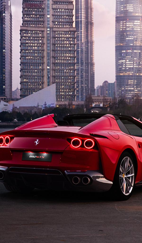 Wallpaper Ferrari 812 GTS car rear view on city background