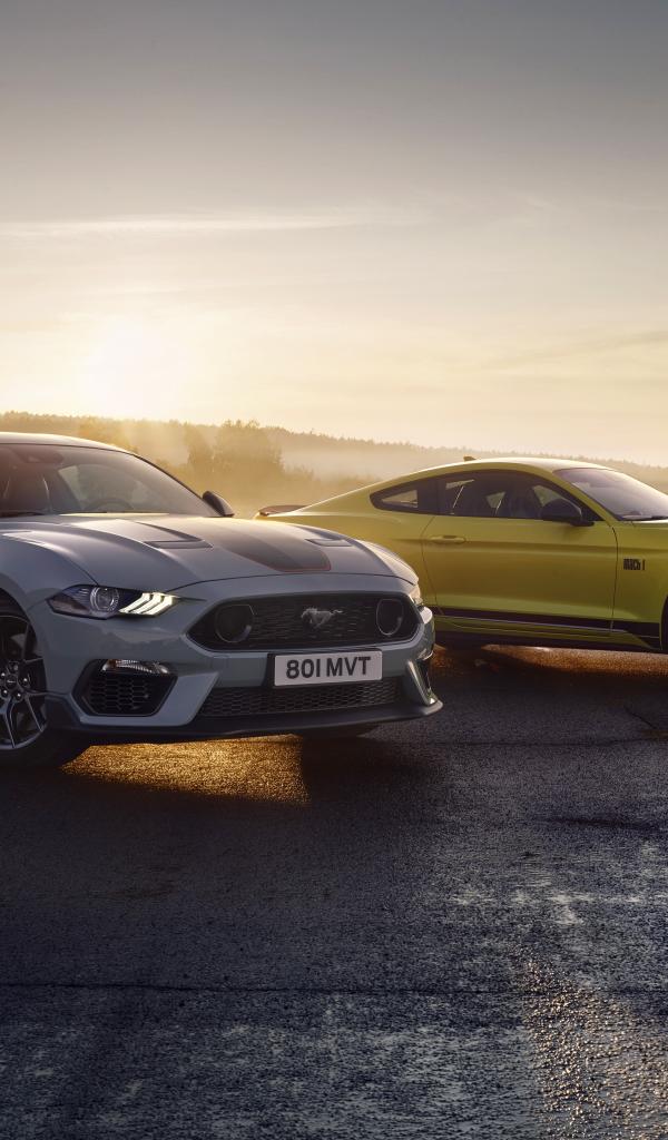 Wallpaper Two 2021 Ford Mustang Mach 1 cars on a foggy morning