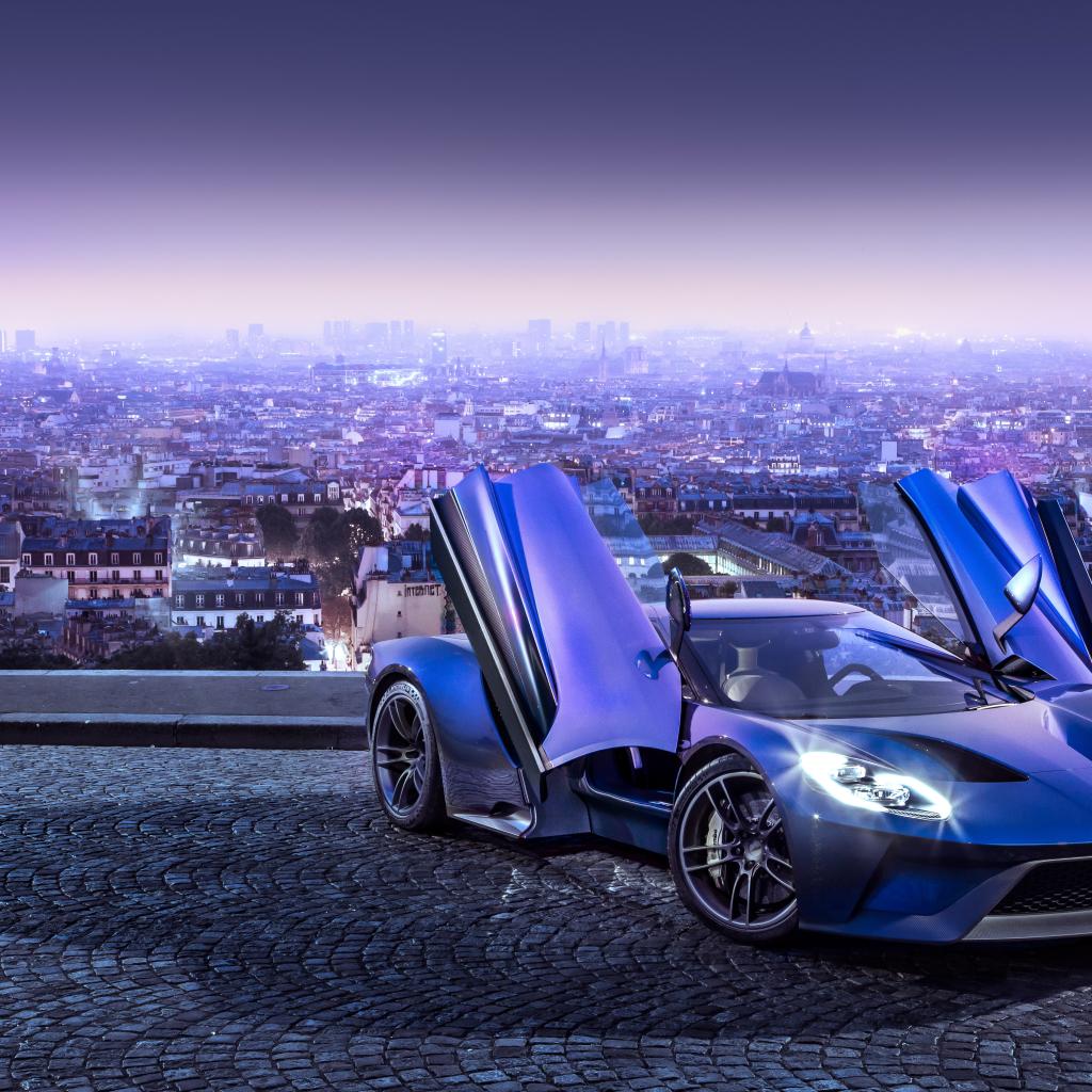 Wallpaper Blue car Ford GT, 2017 on the city background