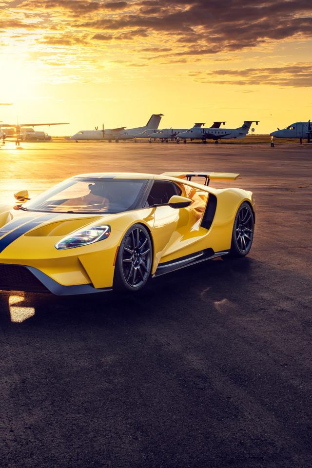 Wallpaper Yellow Ford GT sports car at sunset