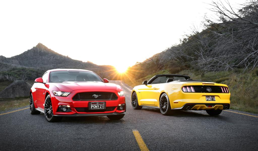 Wallpaper Red and yellow Ford Mustang cars on the road