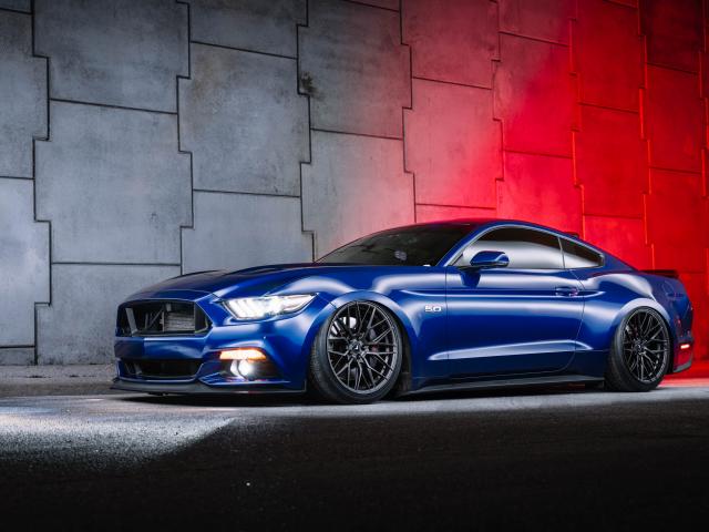 Wallpaper Blue car Ford Mustang GT near the wall