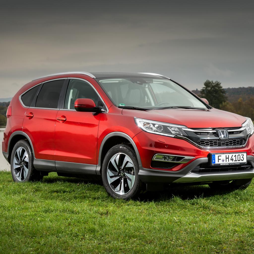 Wallpaper Red SUV Honda CR-V stands on the green grass by the river