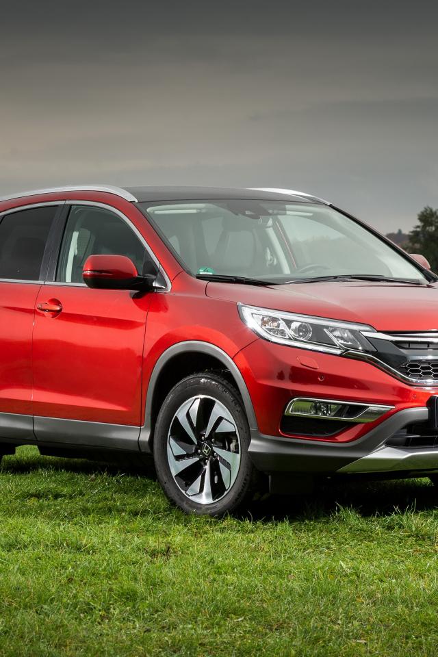 Wallpaper Red SUV Honda CR-V stands on the green grass by the river