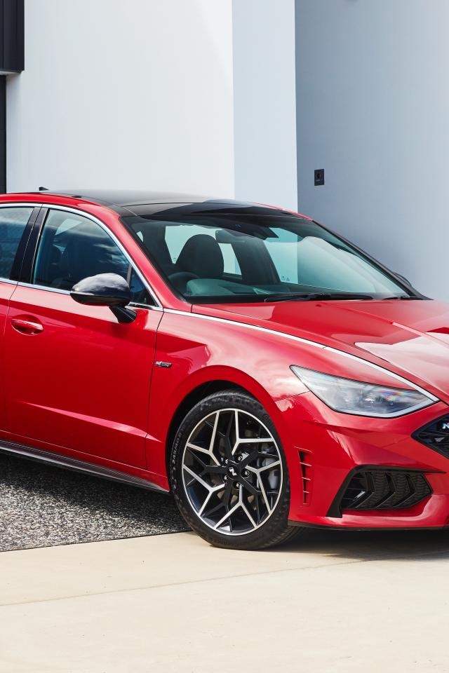 Wallpaper Red 2021 Hyundai Sonata N Line car near the garage
