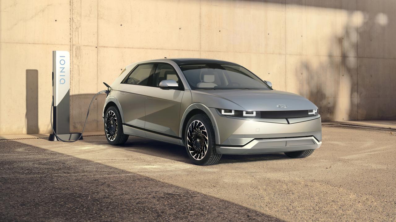 Wallpaper 2021 Hyundai IONIQ 5 electric car at a gas station