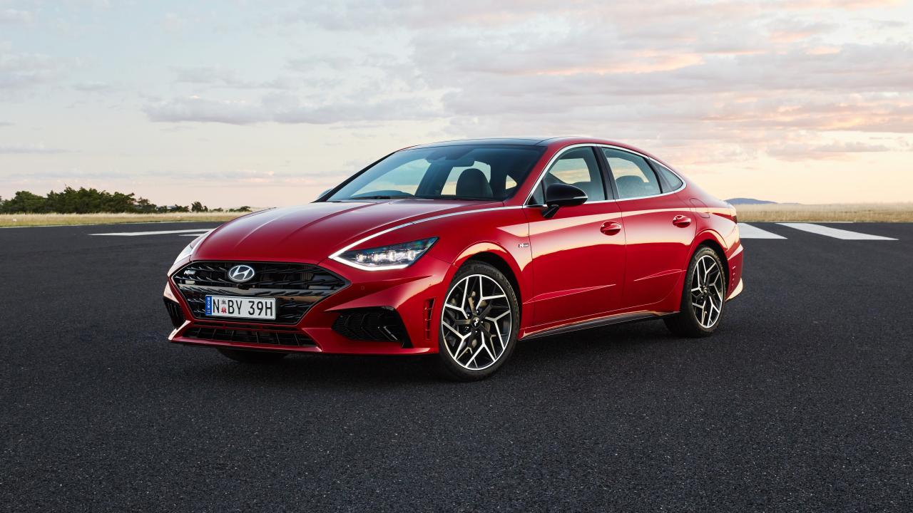 Wallpaper Red 2021 Hyundai Sonata N Line car on the road