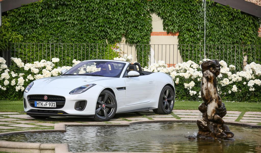 Wallpaper White car convertible Jaguar F-Type at the fountain