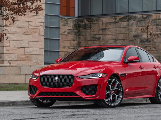 Wallpaper Red car Jaguar XE P300 R-Dynamic, 2020 at the building