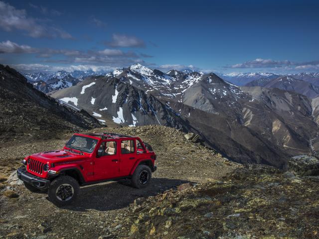 Wallpaper Red Jeep Wrangler in the mountains