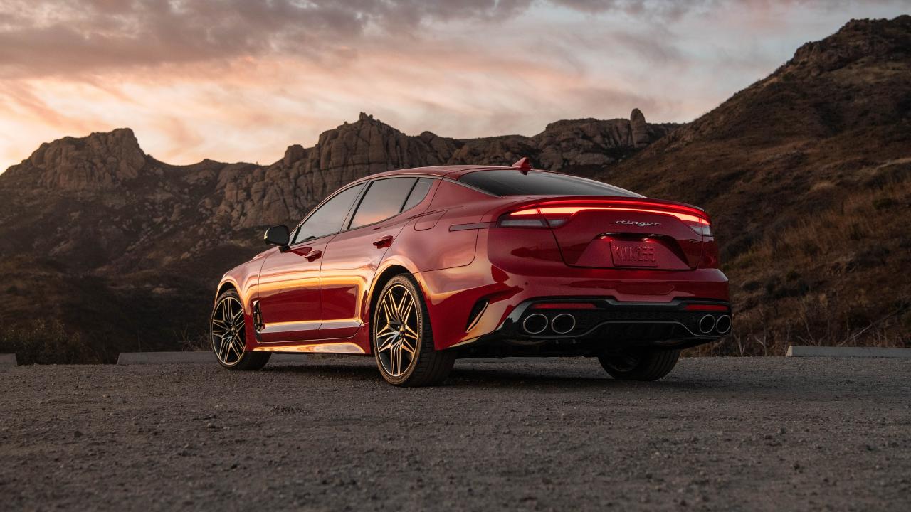 Wallpaper Red car Kia Stinger GT, 2022 in the mountains, rear view