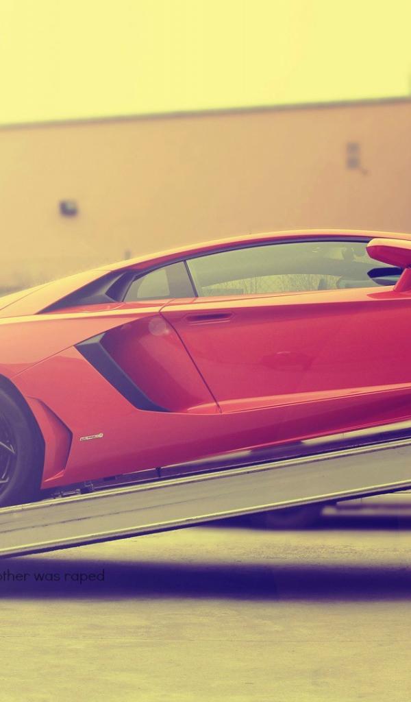 Wallpaper Red Lamborghini Aventador is loaded into a truck