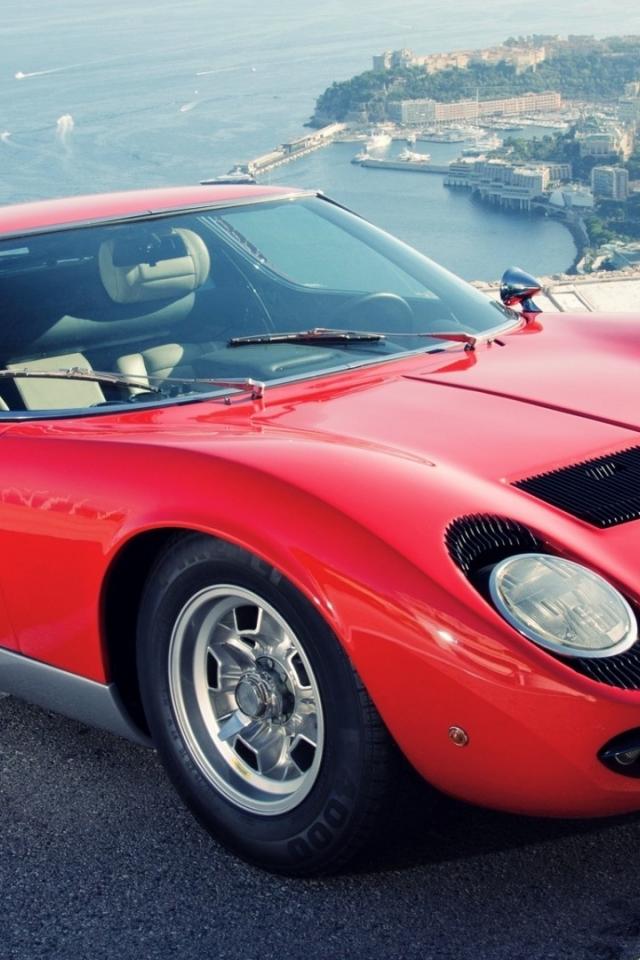 Wallpaper Red Lamborghini Miura in the background of the city