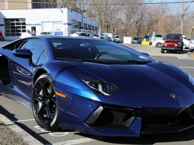 Wallpaper The dark blue car Lamborghini Aventador parked on the street