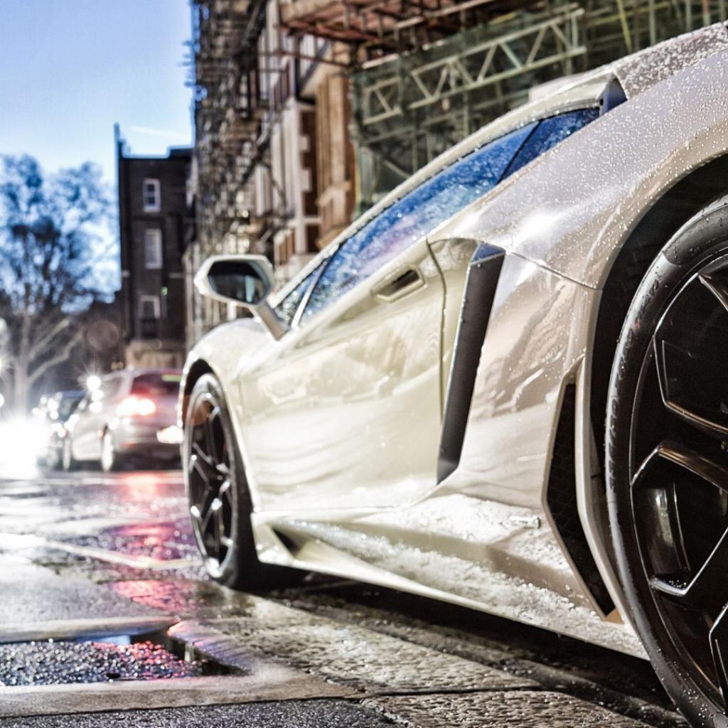 Wallpaper Lamborghini in the rain on a city street