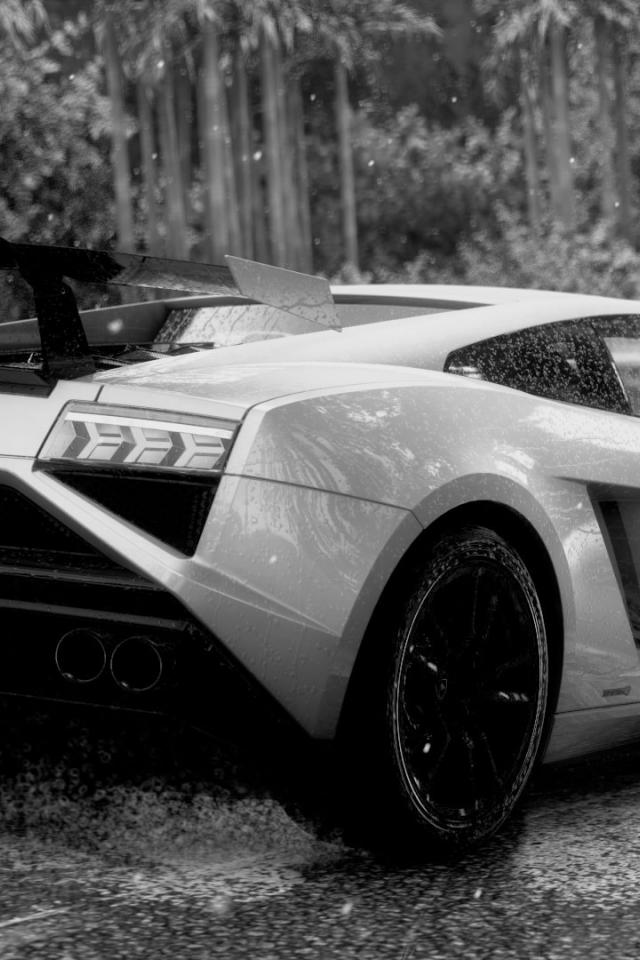 Wallpaper Black and white photo of a Lamborghini in the rain