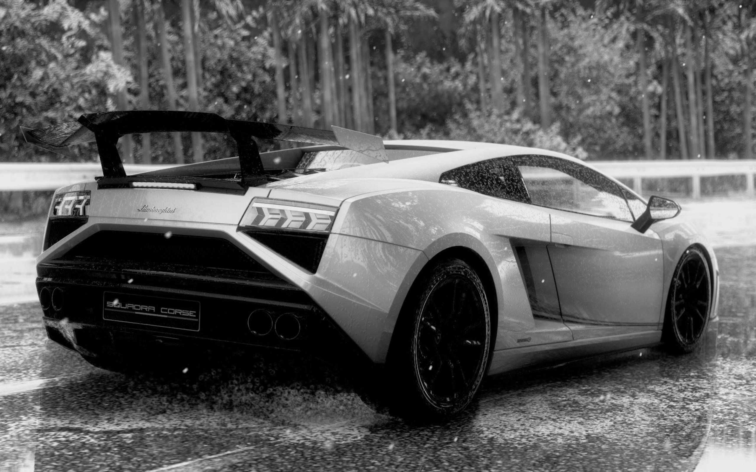 Wallpaper Black and white photo of a Lamborghini in the rain