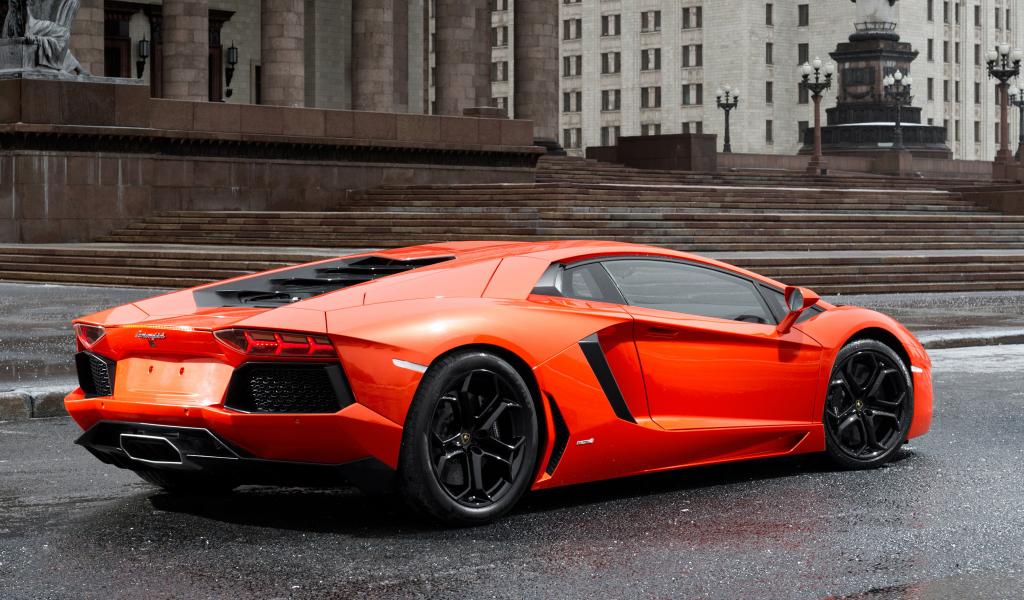 Wallpaper Orange Lamborghini around the building