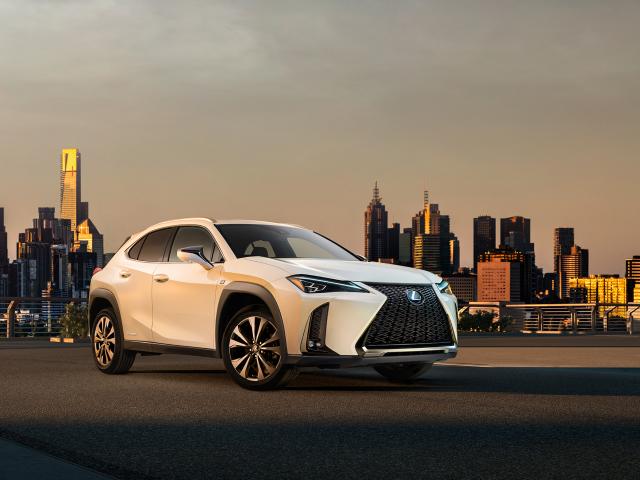 Wallpaper White SUV Lexus UX, 2019 against the background of the city