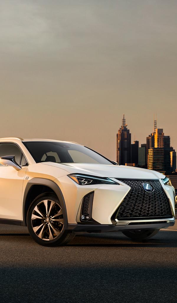 Wallpaper White SUV Lexus UX, 2019 against the background of the city