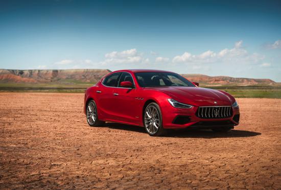 Wallpaper Red car Maserati Ghibli on blue sky background