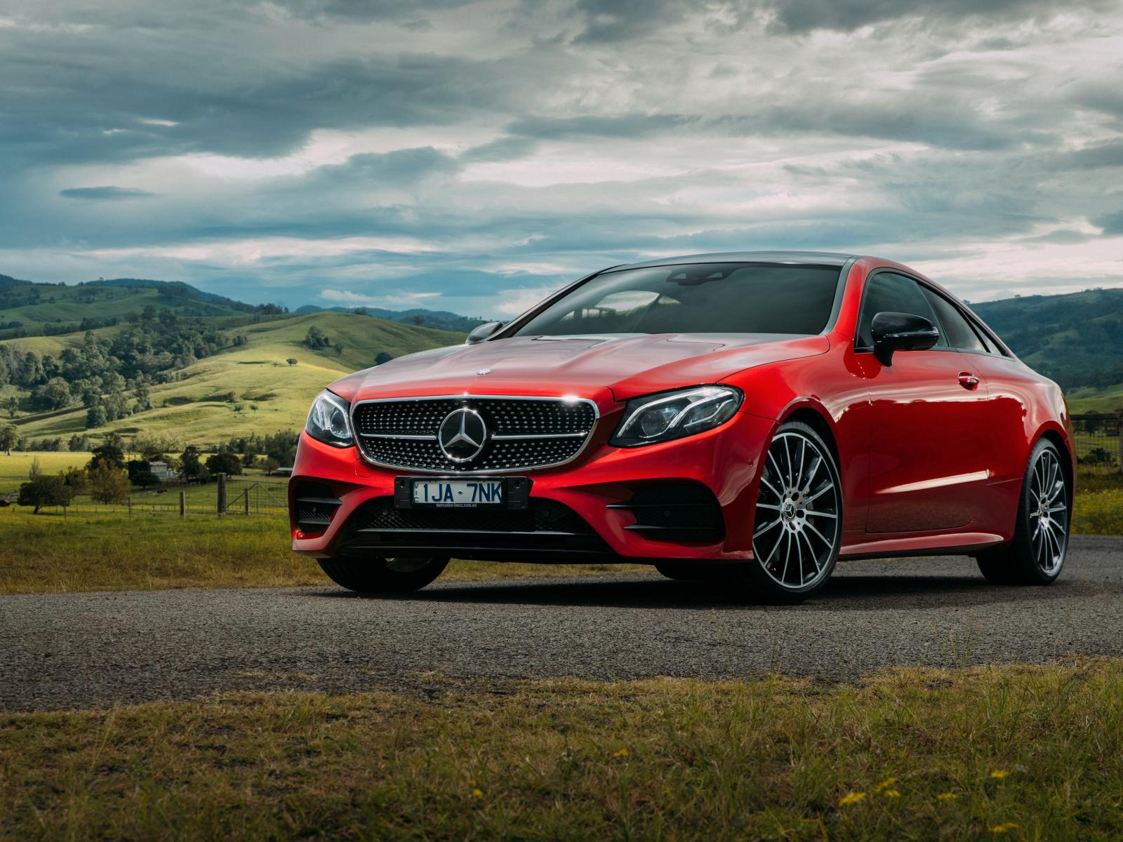 Wallpaper Red car Mercedes-Benz E-Class on a background of nature