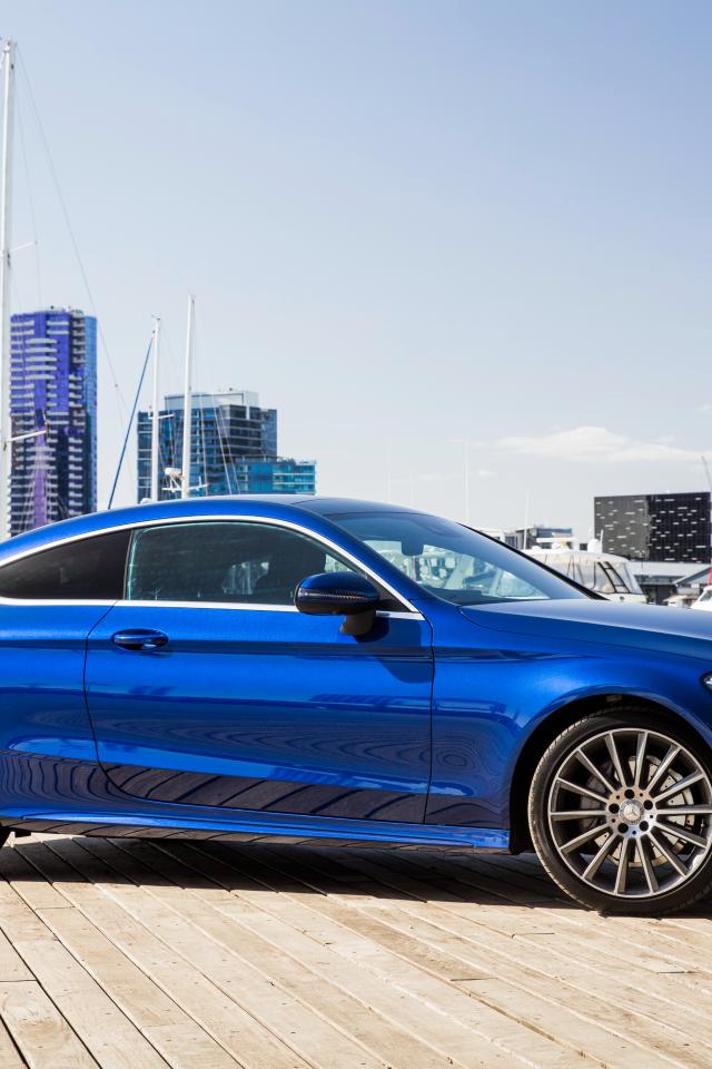 Wallpaper Blue car Mercedes-Benz C205 against city background