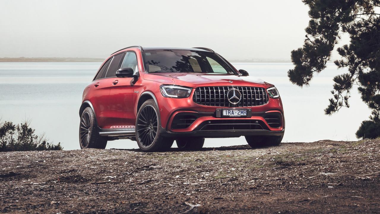 Wallpaper Red Mercedes-AMG GLC 63 S 4MATIC 2020 car near the water
