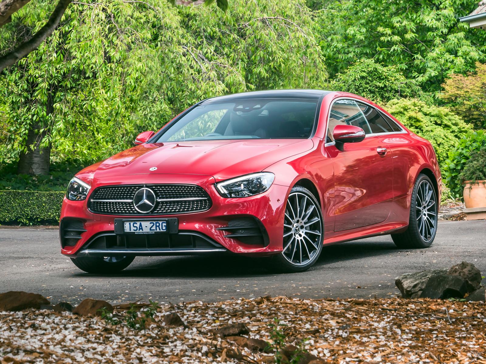 Wallpaper Red car Mercedes-Benz E 300 AMG, 2020 at home in autumn