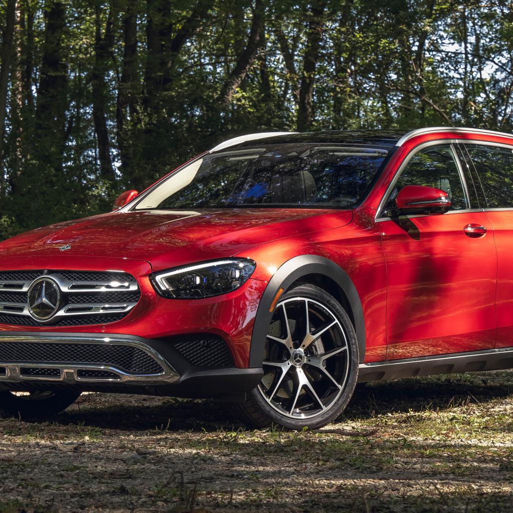 Wallpaper Red car Mercedes-Benz E 450 4MATIC, 2021 in the forest