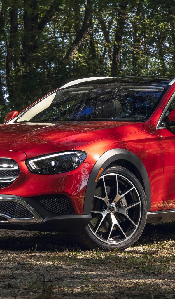 Wallpaper Red car Mercedes-Benz E 450 4MATIC, 2021 in the forest