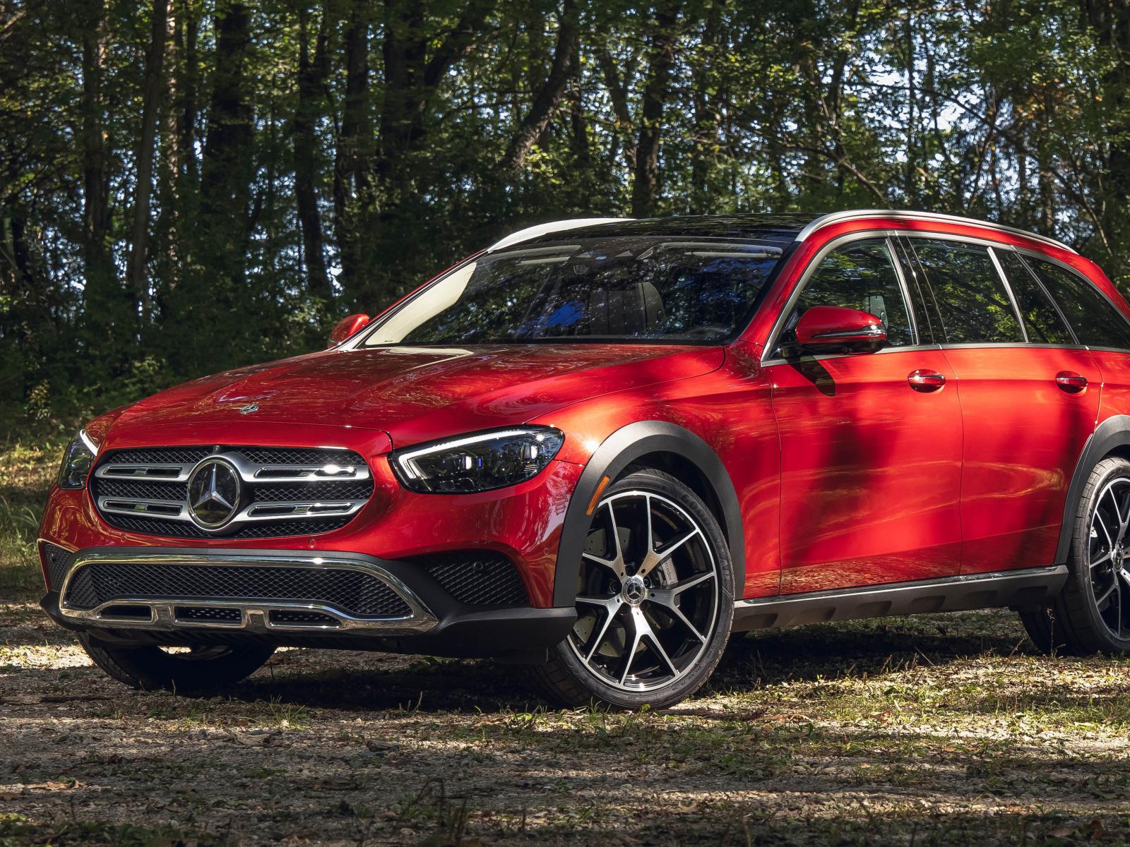 Wallpaper Red car Mercedes-Benz E 450 4MATIC, 2021 in the forest