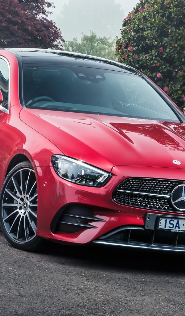 Wallpaper Red Mercedes-Benz E 300 AMG car, 2021 front view