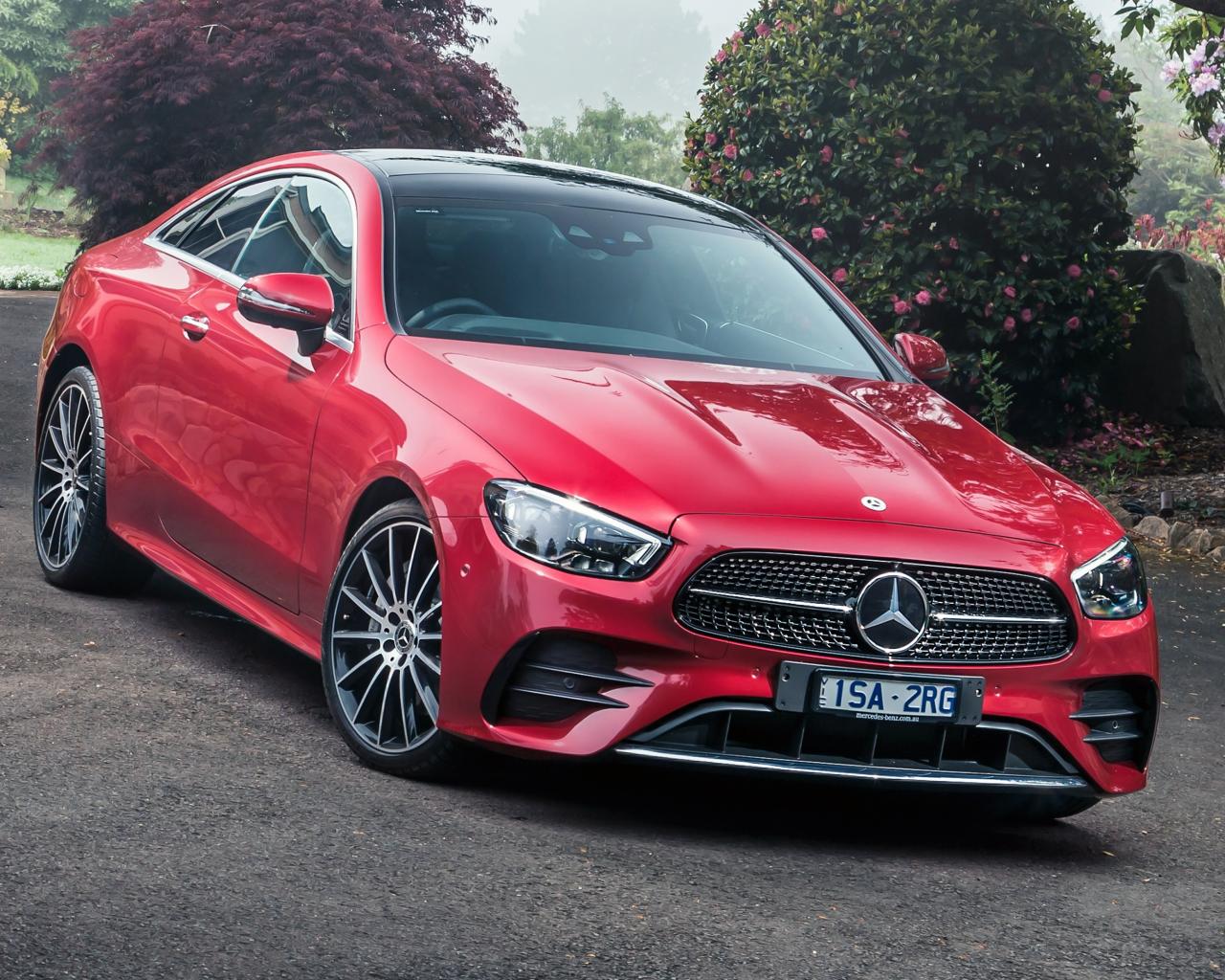 Wallpaper Red Mercedes-Benz E 300 AMG car, 2021 front view