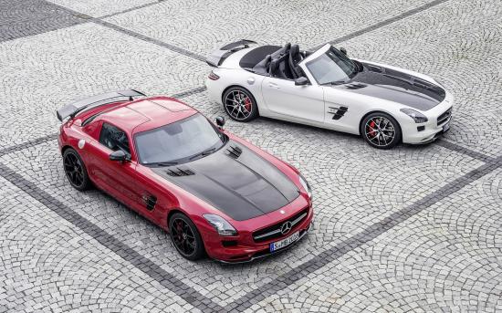 Wallpaper Red and white Mercedes-Benz SLS AMG on the pavement