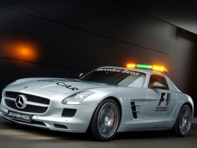 Wallpaper Mercedes Benz SLS AMG F1 leaving with parkings