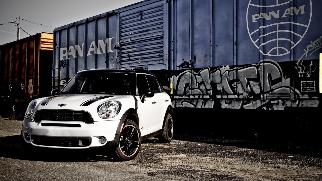 Wallpaper White Mini Cooper near the railroad