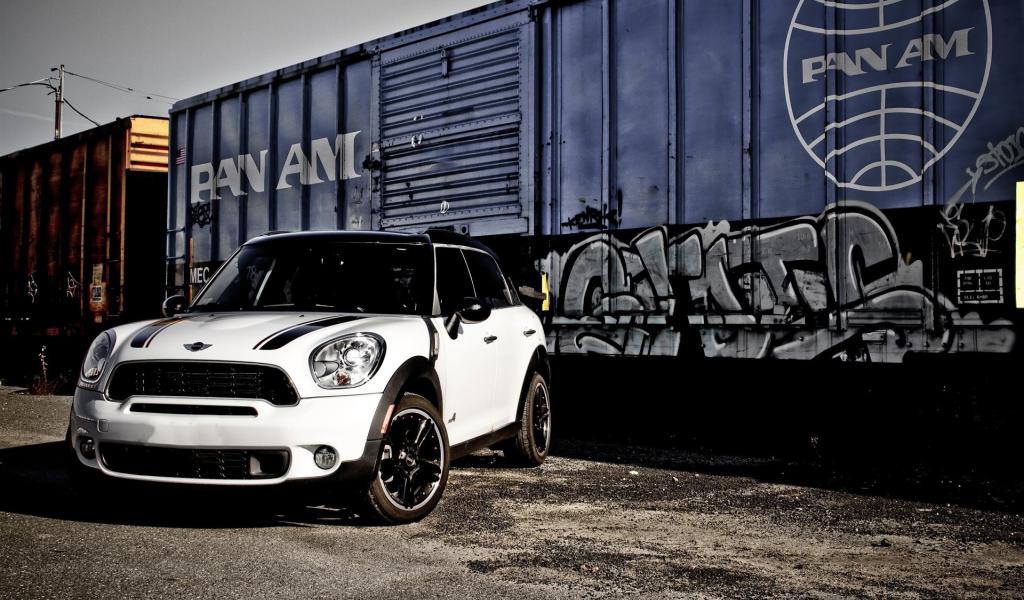 Wallpaper White Mini Cooper near the railroad