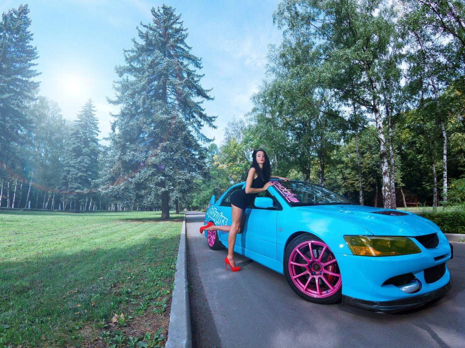 Wallpaper Girl leaning on a blue Mitsubishi Lancer Evo X