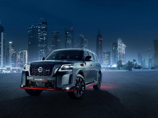 Wallpaper 2021 Nissan Patrol Nismo car against the backdrop of the city