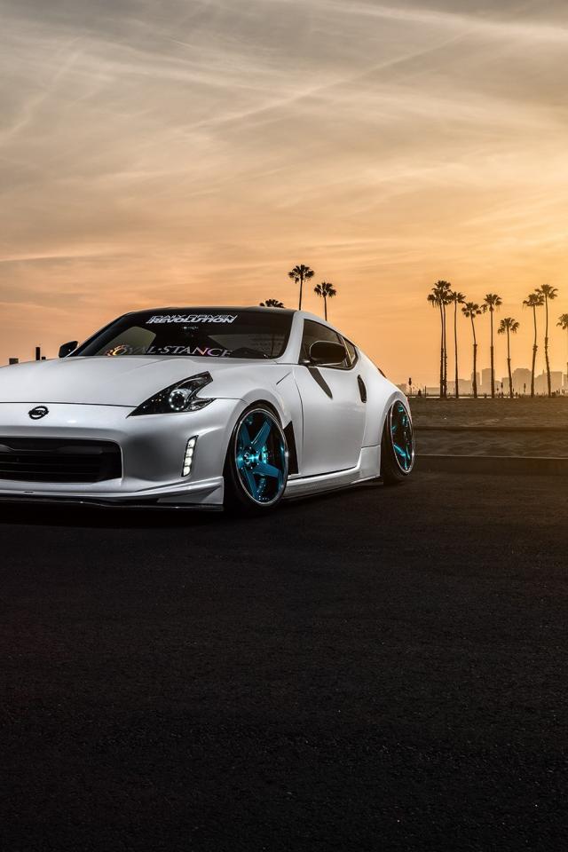 Wallpaper White Nissan 370Z on a background of palm trees and sunset