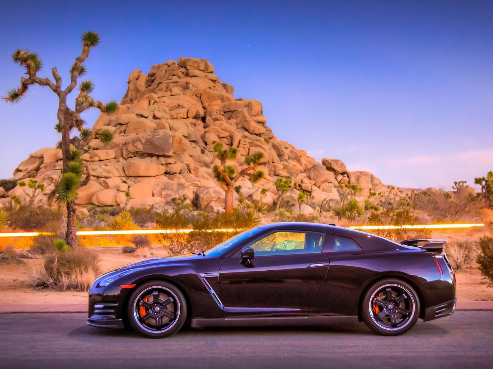 Wallpaper Car Nissan GT-R on the background of rocks