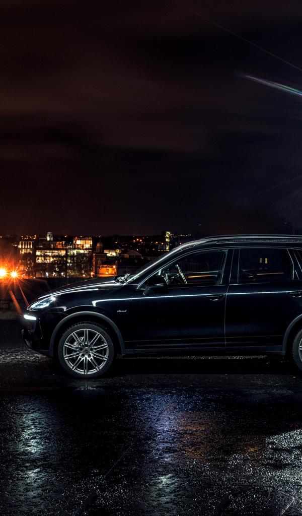 Wallpaper Black car Porsche Cayenne in the light of a lantern