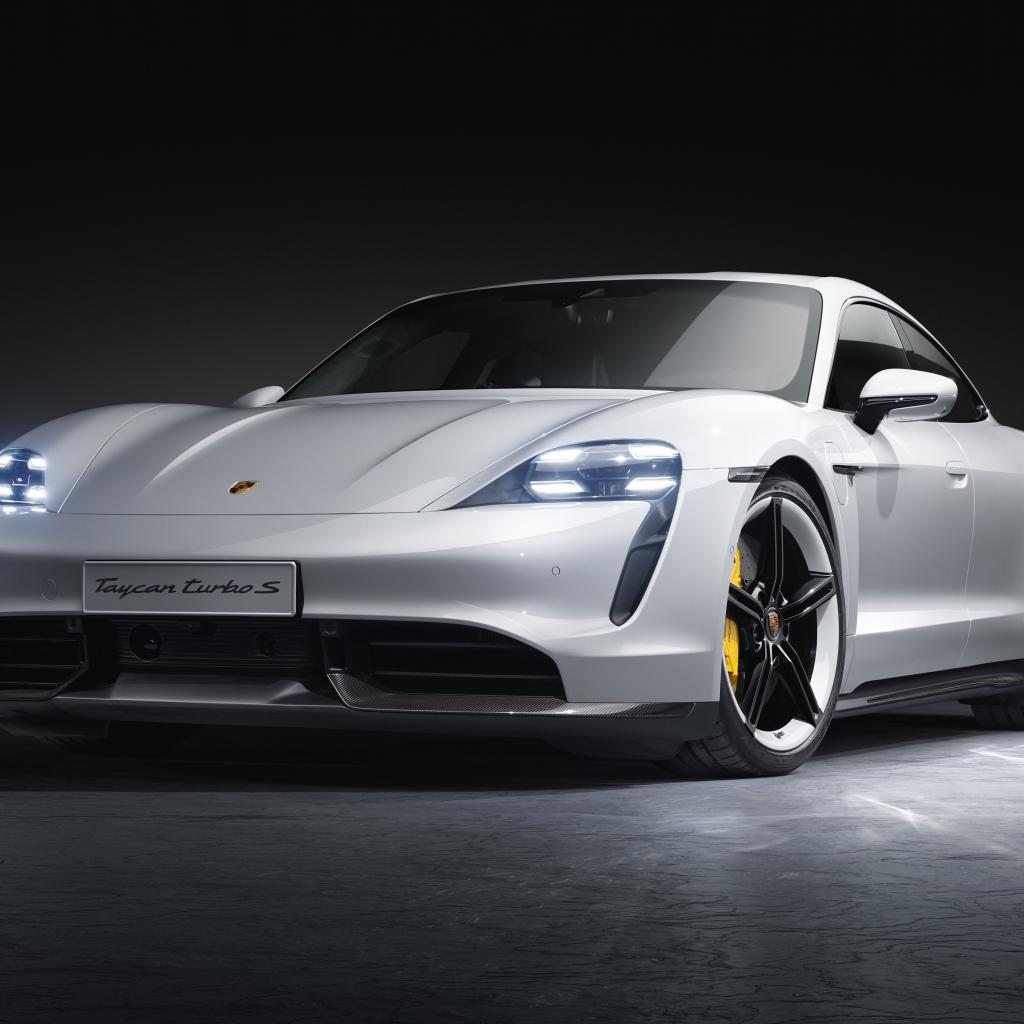 Wallpaper Silver 2018-2019 Porsche Taycan Turbo S on a gray background